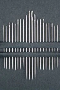 - bout pointu : 6 aiguilles longues n° 5 – 6 aiguilles longues n° 7 – 4 aiguilles longues n° 9 – 2 aiguilles à repriser n° 3 et 2 aiguilles à repriser n° 5 – soit 20 aiguilles ;