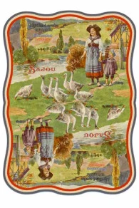 L’extérieur représente une Alsacienne et un petit garçon. L’intérieur est un motif à rayures bleu, blanc et rouge.