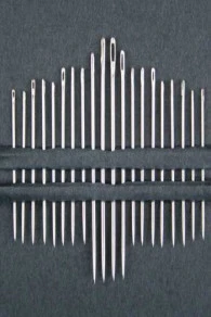 - bout pointu : 6 aiguilles longues n° 5 – 6 aiguilles longues n° 7 – 4 aiguilles longues n° 9 – 2 aiguilles à repriser n° 3 et 2 aiguilles à repriser n° 5 – soit 20 aiguilles ;