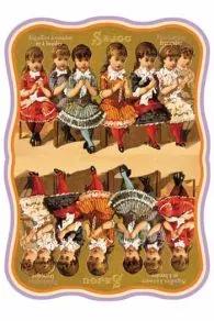 L’extĂ©rieur est un chromo du XIXe siècle reprĂ©sentant de petites filles suivant un cours de couture. L’intĂ©rieur est un papier fleuri dans les tons de rose et de vert.