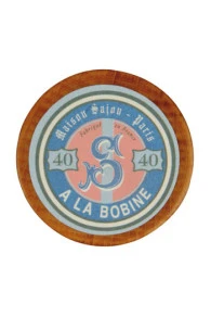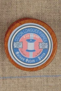 Jolie bobine en bois vernie à l’ancienne avec deux étiquettes Sajou roses.