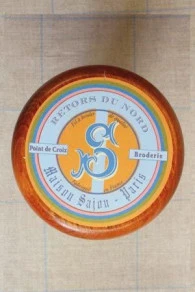Grande bobine en bois Retors du Nord. Cette spectaculaire bobine est une réédition de bobines utilisées dans les usines pour le glaçage des fils. Elle mesure 18 cm de haut, le diamètre des joues est de 8 cm. En principe, ces bobines sont des modèles de travail et elles ne sont pas étiquetées. Mais nous n’avons pas résisté à les habiller avec de belles étiquettes : ici, l’étiquette de notre fil à broder Retors du Nord.