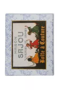 Cette boîte est composée de deux plateaux, celui du dessus étant amovible et pourvu, de chaque côté, de deux petits rubans Sajou facilitant la préhension. Elle est recouverte d’un de nos papiers bleu et blanc, le motif des plateaux pouvant être différent. Le couvercle est, à l’extérieur, revêtu de l’étiquette des Petites Filles Sajou brodant, l’intérieur est décoré d’une étiquette rectangulaire Fil Au Conscrit.