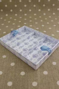 Boîte à couture vide composée de deux plateaux intérieurs, celui du dessus étant amovible et pourvu, de chaque côté, de deux petits rubans Sajou facilitant la préhension. Elle est recouverte d’un de nos papiers bleu et blanc, le motif des plateaux pouvant être différent. Son couvercle est revêtu d’une étiquette Carte Serpentin dans le style Art Déco.