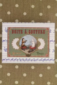 Boîte à couture vide décorée de notre étiquette Chien et Chat pelotant, composée de deux plateaux intérieurs, celui du dessus étant amovible et pourvu, de chaque côté, de deux petits rubans Sajou facilitant la préhension.