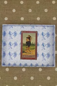 Elle est recouverte d’un de nos papiers bleu et blanc, le motif des plateaux pouvant être différent. C’est un funambule tenant une carte à fil Sajou en équilibre sur son nez qui décore l’étiquette sur la boîte. L’intérieur du couvercle est orné d’une étiquette rectangulaire Fil Au Conscrit.