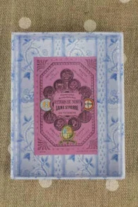L’étiquette sur le dessus du couvercle représente la couverture de nos albums de broderie Sajou mauves et l’étiquette à l’intérieur du couvercle représente le dos de ces mêmes albums.