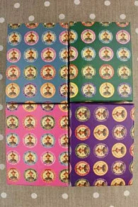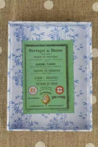 L’étiquette sur le dessus du couvercle représente la couverture de nos albums de broderie Sajou verts et l’étiquette à l’intérieur du couvercle représente le dos de ces mêmes albums.