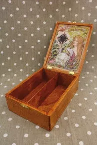 Une grande étiquette de carte à fil ancienne Carte Serpentin, inspirée d’une boîte ancienne, décore le dessus du couvercle, ainsi que son intérieur. Le corps et le cadre du couvercle de cette boîte sont faits en bois d’aulne, le dessus du couvercle est en contreplaqué de bouleau. Elle se ferme au moyen d’un petit fermoir en métal.