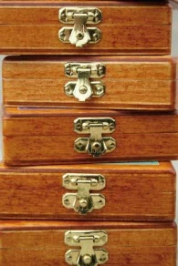 Cette petite boîte en bois rappelle celles que l’on trouvait autrefois dans les catalogues de Nouveautés et autres Articles de Paris. Elle est pourvue de deux charnières et possède un petit fermoir de laiton.