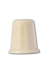 Nécessaire de couture à l’ancienne comprenant une paire de ciseaux façon ivoire veiné motif S, un dé à coudre façon ivoire et une carte à fil assortie.