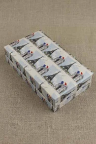Le pompon des ciseaux est assorti aux tons de l’écrin. L’écrin est recouvert de notre tissu enduit Ma Belle Ville de Paris. L’intérieur est coloris crème, marquage Sajou argent dans le couvercle. L’ouverture se fait au moyen d’un petit bouton poussoir coloris argent.