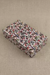 Le pompon des ciseaux est assorti aux tons de l’écrin. L’écrin est recouvert de notre tissu enduit Coquecigrues miniature. L’intérieur est coloris crème, marquage Sajou argent dans le couvercle. L’ouverture se fait au moyen d’un petit bouton poussoir coloris argent.