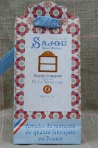 Cette étagère de magasin étiquettes Fil Au Chinois rouges est la réduction à l’échelle 1/12e de celles que nous utilisons dans notre show-room de Versailles dans notre mercerie Sajou à Paris.