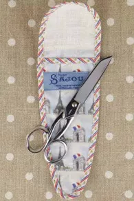 Cet étui convient pour nos ciseaux couturière bancals 17, 18 et 19,5 cm. Il est fait dans notre tissu Ma Belle Ville de Paris (coordonné 1) que nous avons fait enduire en mat, et bordé d’un biais qui lui est assorti. Son rabat est en lin 12 fils blanc cassé, permettant de broder une initiale ou un petit motif. Sous le rabat, une étiquette Sajou bleue.