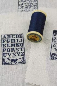Le fil à gant est un fil de coton glacé, n° 120, à la fois fin et solide. Comme son nom l’indique, il était autrefois dévolu à la couture et à la réparation des gants. Les usages ont changé, mais le nom est resté. De nos jours, le fil à gant s’utilise pour les travaux de couture comme le patchwork et l’application, plutôt conseillé pour un usage à la main. Le fil à gant peut aussi être employé pour des broderies très fines au point de croix. Étant assez raide, il est très agréable à utiliser. Ici, une page d’albums Sajou réalisée sur de la toile de lin 12 fils au cm sur un fil.