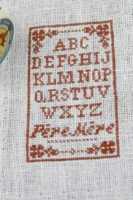 Le fil à gant est un fil de coton glacé, n° 120, à la fois fin et solide. Comme son nom l’indique, il était autrefois dévolu à la couture et à la réparation des gants. Les usages ont changé, mais le nom est resté. De nos jours, le fil à gant s’utilise pour les travaux de couture comme le patchwork et l’application, plutôt conseillé pour un usage à la main. Le fil à gant peut aussi être employé pour des broderies très fines au point de croix. Étant assez raide, il est très agréable à utiliser. Ici, une page d’albums Sajou réalisée sur de la toile de lin 12 fils au cm sur un fil.