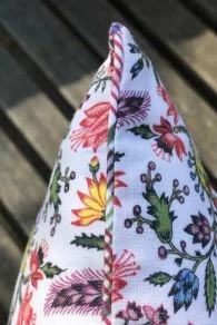 La finition est très raffinée, avec un passepoil écossais assorti au tissu. Au dos, la fermeture se fait en portefeuille, avec un croisement large du tissu afin que cela ne baille pas. Étiquette Sajou bleu au dos. Ce format 40 x 40 est standard et vous trouverez très facilement un coussin pour garnir cette housse.