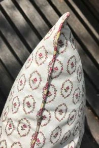 Housse de coussin 40 x 40 cm dont les deux faces sont faites de notre tissu Léontine principal. La finition est très raffinée, avec un passepoil dans le coordonné n° 1 de la collection Léontine, assorti au tissu principal. Au dos, la fermeture se fait en portefeuille, avec un croisement large du tissu afin que cela ne baille pas. Étiquette Sajou bleu au dos. Ce format 40 x 40 est standard et vous trouverez très facilement un coussin pour garnir cette housse.