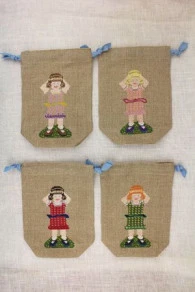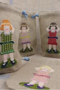Elle a les cheveux roux et sa robe est dans les vert et oranger. Elle est brodée de face sur le devant du sac et de dos sur l’arrière sur du lin 12 fils au cm.