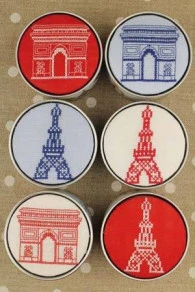 Boîte ronde à broder d’un Arc de Triomphe rouge sur une toile blanc cassé.