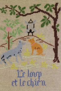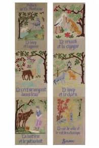 Le Loup et l’Agneau, Le Cerf se voyant dans l’eau, La Laitière et le Pot au lait, Le Renard et la Cigogne, Le Loup et le Chien et Le Rat de Ville et le Rat des Champs sont les six Fables composant ce kit de point de croix.