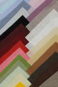 Carte en trois parties présentant nos 28 coloris de lin à broder 12 fils au cm. Chaque échantillon mesure 2 x 3 cm et les couleurs sont classées par gamme, de manière à pouvoir les comparer facilement. Les trois cartes sont reliées par un ruban Sajou.