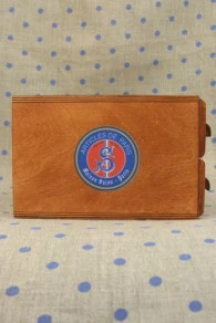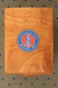 Petit meuble en bois décoré sur le dessus et chacun des côtés d’une étiquette ronde Sajou Articles de Paris.