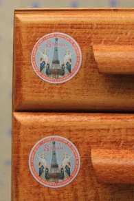 Chacun des deux tiroirs est décoré de deux petites étiquettes rondes (35 mm) représentant des tours Eiffel.