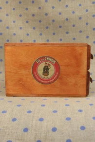 Petit meuble en bois décoré sur le dessus et chacun des côtés d’une étiquette ronde Fil Au Chinois rouge.