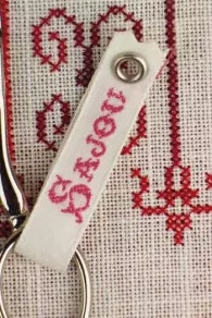 Une des lames de cette petite paire de ciseaux se termine pour un bout arrondi, ce que l’on appelle une lentille. Cela permet, par exemple, lorsqu’on coupe un tissu plié en deux, d’être sûr de ne pas couper l’épaisseur du dessous, la lame arrondie ne pouvant pas y pénétrer. Ces ciseaux en acier nickelé sont utilisés pour le boutis.