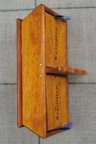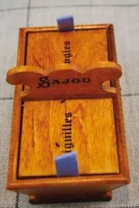Réédition d’un petit panier du XIXe siècle à deux abattants, permettant de ranger, d’un côté des aiguilles, de l’autre, des épingles. Il est en bois, teinté couleur merisier. Deux petits morceaux de ruban, dont la couleur peut varier, permettent d’ouvrir facilement chacun des deux abattants.