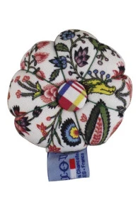 Arborant la forme d’une petite citrouille, ce pique-épingles est fait dans notre tissu Coquecigrues. Il est fortement rembourré, de manière à pouvoir accueillir aisément vos aiguilles et épingles et est revêtu, dessus et dessous, d’un petit bouton en son centre.