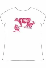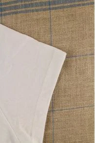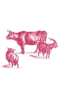 Dans le dos, un détail de notre toile de Jouy Plaisirs de la Campagne : petit groupe constituté d’une vache, d’un mouton et d’un chèvre.