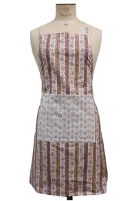 Tablier de cuisine en tissu de coton Léontine, il s’agit ici du motif principal, à rayures et fleurs. La grande poche de devant est dans le coordonné 2, un motif de petites couronnes. Les liens sont faits d’une sangle de lin de 2 cm de large qui, tous les 8 cm, est sérigraphiée du nom de Sajou en bleu. La bavette est taillée en arrondi et mesure en haut 24 cm. Le lien passant autour du cou mesure 60 cm. Les liens de tour de taille mesurent chacun près d’un mètre, ce qui permet à ce tablier d’être porté par toutes les statures. Cela permet également de le nouer devant.