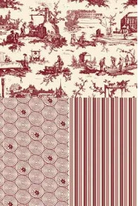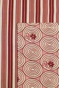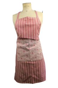 Tablier de cuisine en tissu de coton Travaux de la Manufacture bordeaux, qui est la réédition d’un motif de la Manufacture Oberkampf à Jouy. Il s’agit ici du motif coordonné n° 2, un motif à rayures bordeaux sur fond crème. Les liens sont faits dans le même tissu. La grande poche de devant est dans le coordonné 1, motif géométrique parsemé de fleurs. La bavette est taillée en arrondi et mesure en haut 24 cm. Le lien passant autour du cou mesure 60 cm. Les liens de tour de taille mesurent chacun près d’un mètre, ce qui permet à ce tablier d’être porté par toutes les statures. Cela permet également de le nouer devant.