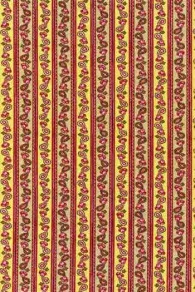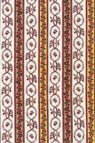 Trois coupons de tissus Léontine, le motif principal et ses deux coordonnées, rayures et couronnes.
