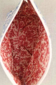 Grande trousse en toile enduite dans notre tissu Offrande à l’Amour miniature bleue. Elle est doublée du même tissu en rouge.